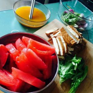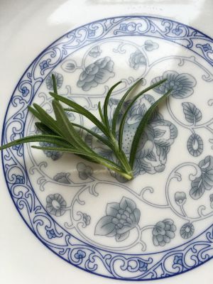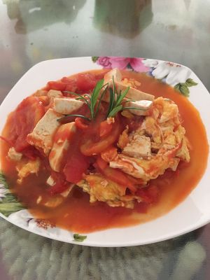 用炒鸡蛋的底油炒西红柿,加少许酱油、糖,水,放豆腐,稍炖一两分钟,再放入炒好的鸡蛋,起锅装盘,点缀新鲜迷迭香即可。