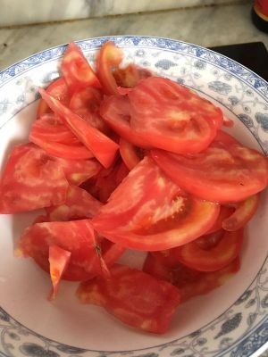 西红柿要选比较小的个头,三个,去皮,然后用刀顺着西红柿本身的纹路,切成橘子瓣稍大的块,就像图中那样,其实西红柿跟橘子一样也是有自然纹路的!这样切,炒西红柿的时候能够控制出水量,不至于把西红柿完全炒成稀烂的番茄酱