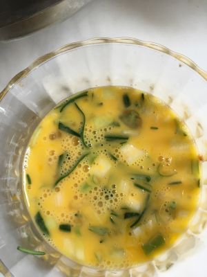 鸡蛋两个,加盐,和一点点水,一点点料酒,搅拌均匀