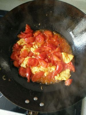炒鸡蛋,加西红柿,放糖、盐,出锅开吃!