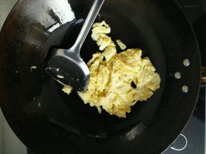 打鸡蛋的时候少许盐,然后将热锅放油把打好的鸡蛋倒入翻炒至金黄色盛出备用