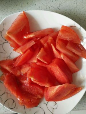 9,放西红柿加少许清水,煮至西红柿变软,水份变少。(记得西红柿入锅后,不要再翻炒。)