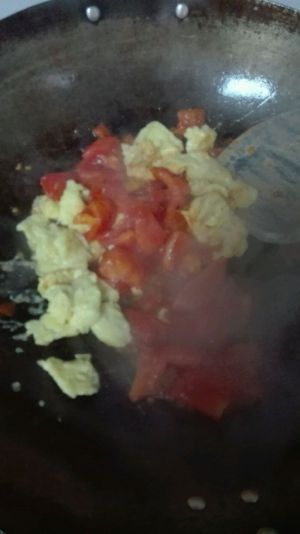 西红柿加少量盐,之后倒入鸡蛋,翻炒均匀即可关火。