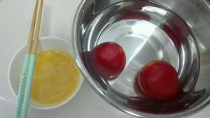 鸡蛋加少量盐打散,西红柿洗净温水浸泡(为了去皮,嫌麻烦的童鞋此步骤可省,带皮丝毫不影响口感)