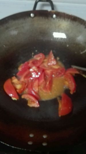 放少量油,大火爆炒西红柿(必须是大火,这样才能把西红柿里的汁榨出来)