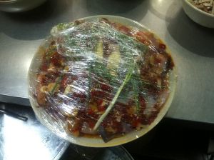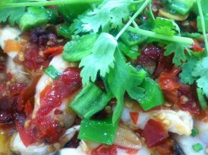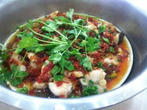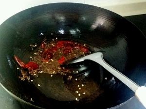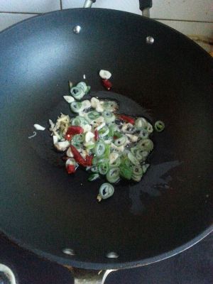 撒把蒜泥,葱花,花椒,干辣椒、白芝麻,辣椒都塞在当中,最重要的时候来了,那就是炸油。一定要特别特别小心。搞不好就烫伤。弄好了就完美。