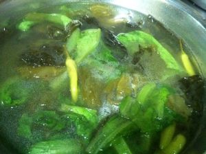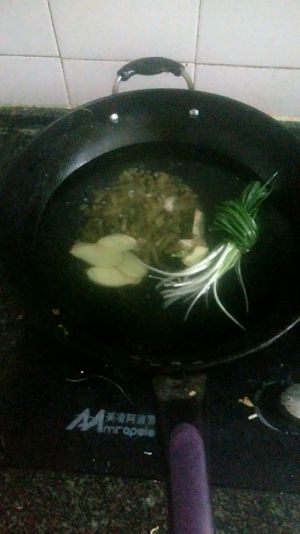 锅洗净 入水 加入姜片 泡菜 葱结,烧开