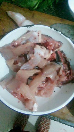 这次选的是一条二斤半的草鱼,鱼处理好后(内脏黑膜处理干净,腥线摘除)贴着鱼骨把鱼肉剔除,鱼肉片成片(只要刀锋利很好弄,不需要太薄,如果不方便可以直接剁成大块),鱼骨剁大块儿。鱼肉腌制十分钟,一勺盐,一勺胡椒粉,两勺生粉,料酒少许,鸡蛋清一个。