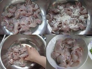 第一步、把鱼片片好,一般卖鱼的可以帮你片,其次,把片好的鱼片放入盆内,放入盐、蛋清、小苏打,加水至鱼片的1/2,上下翻动拌至水份变的特别黏稠,抓在手上几乎不会流下的那种感觉,那就算是浆到位了、然后用保鲜膜封起来放入冰箱冷藏一个小时、