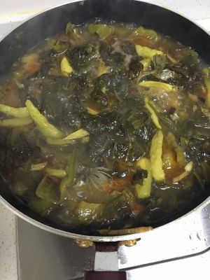 酸菜倒入后并放入准备好的野山椒,然后加水,烧开后加入味极鲜,根据口味加入适量的盐再小火煮一刻钟等待酸菜全部入味盛出酸菜。