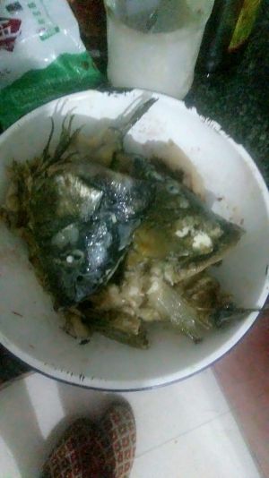 这是我烧的跺椒鱼头的照片不要理会,等鱼片水沸腾,看鱼片发白几乎没有血红,就用漏勺轻轻捞起鱼片铺在底料上面。