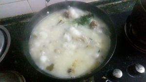 加入大骨汤或者清水,放入鱼头一起炖煮。