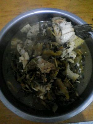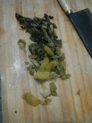 另用炒锅置火上,下猪油烧热,下姜片、葱段、泡辣椒(切末)、泡青菜500克(切节),炒出香味,倒入火锅汽中熬煮,再下其余的泡青菜节,并加入精盐、胡椒粉和味精,即为卤汁。
