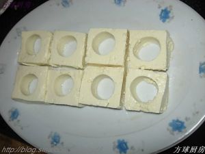 把豆腐切成相等的小块,然后中间掏个洞,我是用不锈钢的裱花嘴弄的,很方便,掏出来的圆球我做另一个菜了,不久你们就会在我博客里看到。