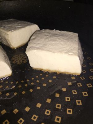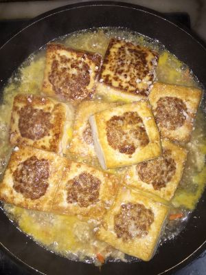 锅中倒入热油,讲豆腐块有牛肉的一面朝下放入油锅,小火慢煎,直至金黄后再将其它面炸至金黄