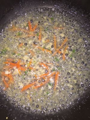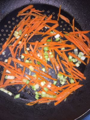 锅里加入胡萝卜丝和葱白炒香