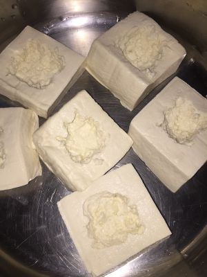 豆腐切成长方形,中间用小勺挖掉一小部分,留个凹槽