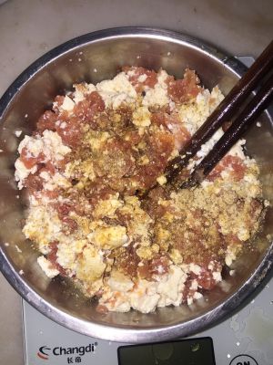 肉末用油、盐、胡椒粉、酱油、挖出的豆腐拌匀