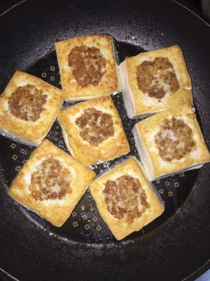 将肉酿入豆腐里,肉不要突出豆腐太高,否则煎时肉和豆腐煎出来的颜色不一致