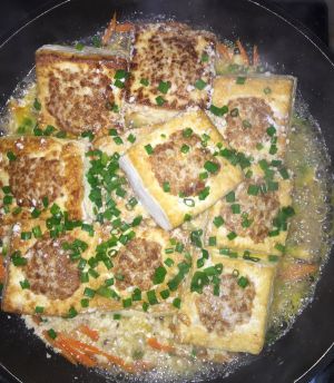 豆腐和肉熟后加入葱花,豆腐盛起