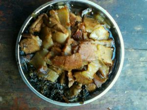 3豆腐乳抹到肉上面,抹均匀,把酸菜放到上面,放到蒸锅里面加足够的水,先大火,水开后小火蒸两个小时或者一个小时!时间越长肉越入味,豆腐乳够咸所以不用加盐了!出锅后把碗扣过来就可以了!