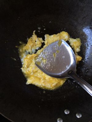 油热时鸡蛋下锅,待鸡蛋成型时,用铲子铲成大块,装盘备用