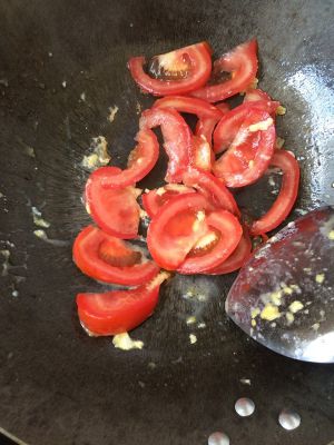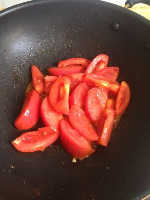 再放入一勺油,油热后,把准备好的西红柿倒入锅里,翻炒。