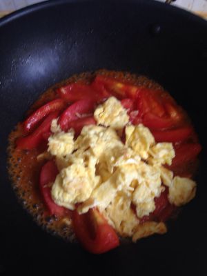 西红柿下锅用铲子碾碾,待汤收的差不多时撒入少量盐,翻炒几下后倒入鸡蛋