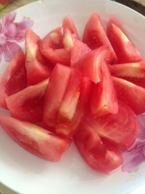 西红柿用开水烫一下,好剥皮,把剥好皮的西红柿切尽量小块