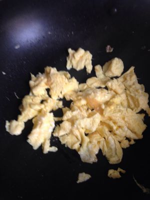 锅加热,放入1勺油,加热后,把鸡蛋放入国内,翻炒。约1分钟,鸡蛋基本凝固成型,就起锅,装入碗里备用。