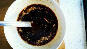 在煎的同时,将生抽、醋、糖、料酒调成汁,待用。