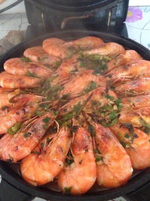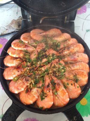 在整齐的青虾上撒上备好的葱、姜和辣椒。开始倒入色拉油,沿着虾的摆放顺序倒上一圈,油多一点。盖上上盘焖十分左右即可,如果吃起来味道较淡可以淋上生抽。味道极好~