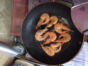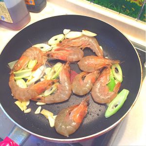 起锅,放入适量的油(因为我家对油是有控制的,所以不适用油炸)放入虾头,炒出虾油,拣出虾头,把改刀好的虾仁翻炒,看见虾变颜色,盛出至砂锅