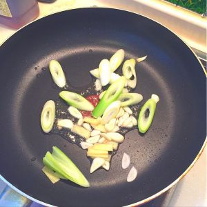 炒锅放适量的油,倒入切好的蒜、姜、小米辣,要多炒一会,炒出辣味炒出香味,然后放入生抽、蚝油,适量水、盐,搅拌均匀,倒入砂锅