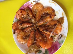 起锅入油,放入大虾。使虾两面沾油。炒至金黄色出锅。