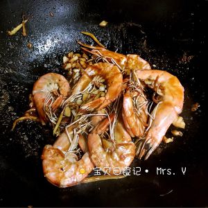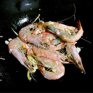 加入大虾大火翻炒,将虾炒至变色后加适量生抽、白糖、鸡精继续翻炒2分钟后,加少许盐转小火翻炒约1分钟