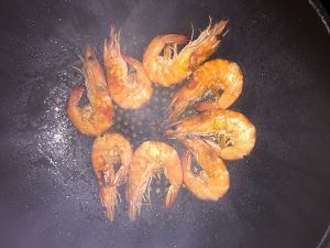 翻炒至虾变红,加入水没过虾,大火焖5分钟,起锅
