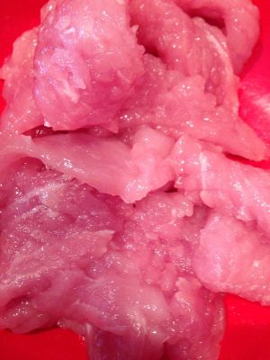 里脊肉切块,加鸡蛋一个,红薯粉,水,酒糟(酿好酒后剩下的红曲米,没有可以不加)搅拌均匀