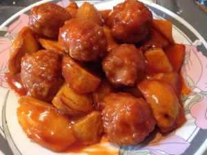 调碗汁,放番茄酱,糖,鸡精盐,少许水,调匀,锅里放少许油,油热下碗汁,碗汁熬制一会儿,水淀粉勾芡,下肉丸和土豆,翻炒均匀即可出锅