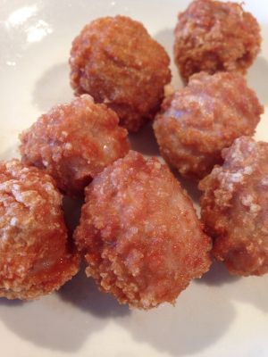 鸡肉剁成肉末,加一个鸡蛋、盐、蚝油、料酒。 顺时针搅拌至上劲。用手湿水搓成丸子放油锅里中火炸成金黄色。