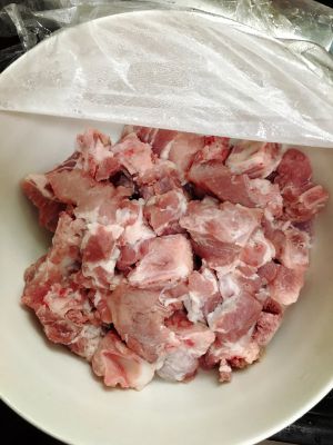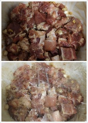 用白糖腌制排骨。一般两根排骨要用普通勺子搞三四勺白糖,把排骨均匀抹上白糖,然后就是静置一个小时以上,时间长点更好。因为天气热,我就封上保鲜膜,放进冰箱保鲜层放置。图片是我腌制好拿出来拍的。