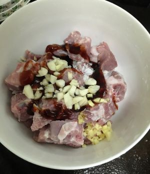 把排骨捞出在盘里,姜切丝,大蒜略拍剁碎放到排骨里,加入耗油、淀粉、油、盐拌匀,腌制10分钟
