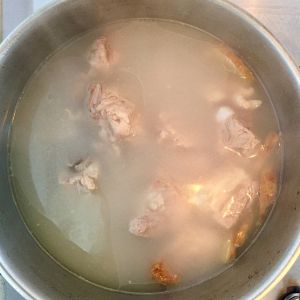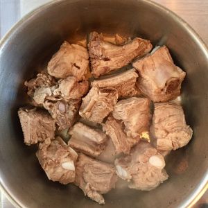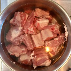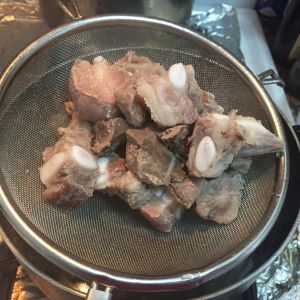 烧热水,水开后放排骨 再一次水开,捞出浮沫,取出排骨,用温水冲洗,晾干