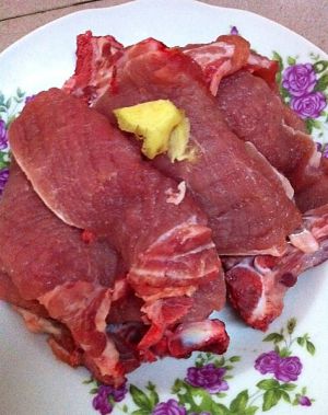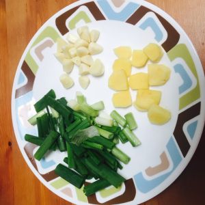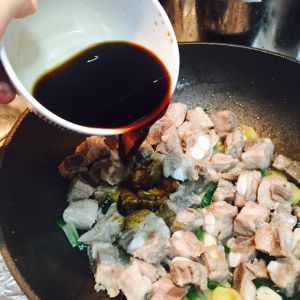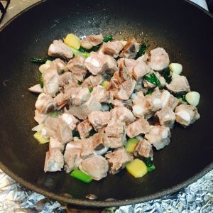 锅烧热油,葱姜蒜下锅,爆香 用姜片把锅底擦一遍,一会儿肉不会粘锅 加入排骨