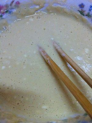 鸡蛋调匀加入少许清水,然后加入面粉拌成糊状。面湖中加入少许盐调味。