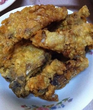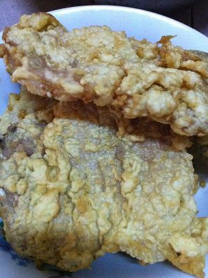 拿一块大排,在面糊中蘸一下,使两面都粘上面糊,然后再两面粘上干面粉,然后下入热油锅中炸。
