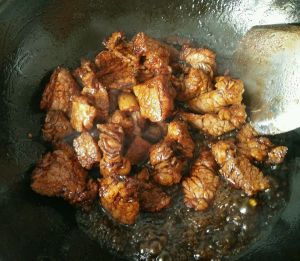 放入牛肉翻炒,炒出香味表面有少许焦黄