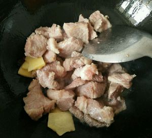 六成油温,下姜,蒜爆香,下牛肉翻炒。牛肉之前切丁用开水超过。也可以抄牛肉时稍微大煮一会。