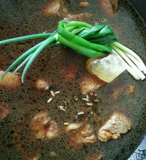 翻炒一会后,加入温水,水要漫过牛肉,放入冰糖块,葱,八角等,盖好大火烧开,改中小火
