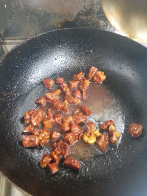 放入牛肉翻炒,炒出香味表面有少许焦黄